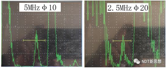 下图是两个不同频率的探头对φ1平底孔的反射回波比较,可以看出5MHz比2.5MHz的信噪比高。因此,增加频率,确实可以提高检测灵敏度。